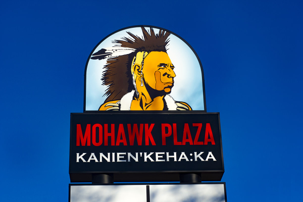 After crossing the Mercier Bridge, you enter the community, and the first thing you notice are the red stop signs surmounted by the Mohawk word “Testan” (STOP). The reserve is well-maintained, with The reserve is well maintained, with roads lined with tree-shaded houses.